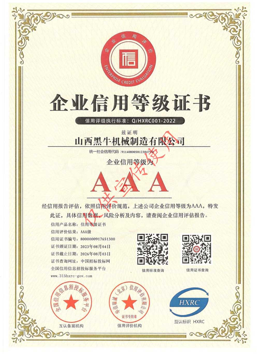 企業(yè)信用等級證書AAA