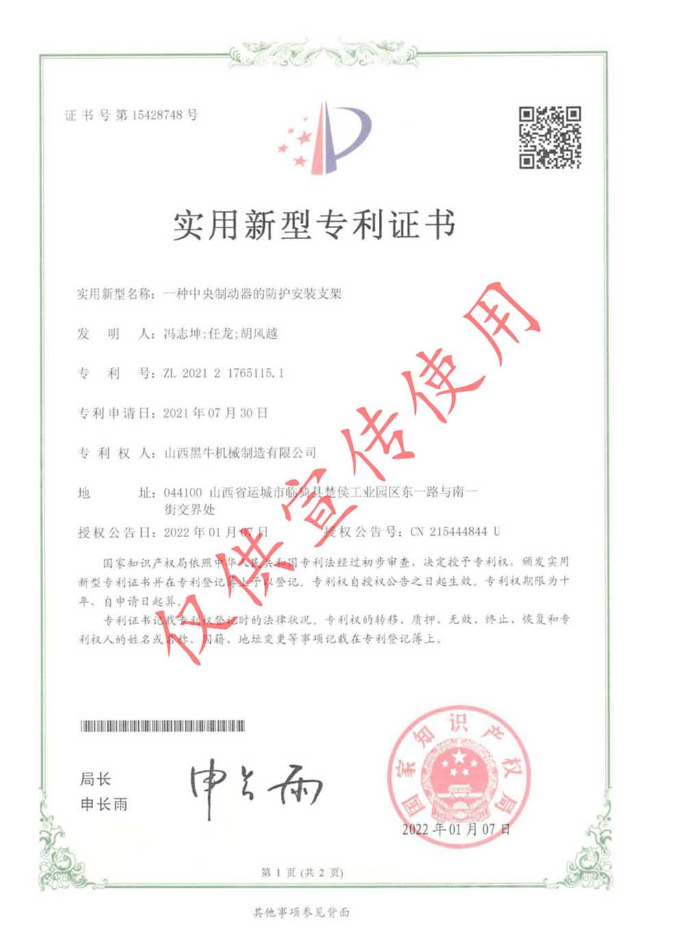 實(shí)用型專利證書