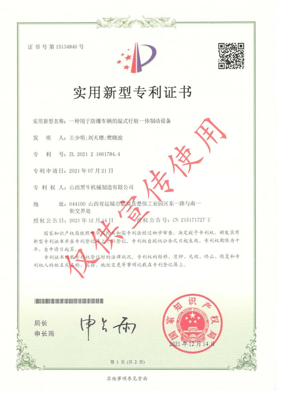實(shí)用型專利證書