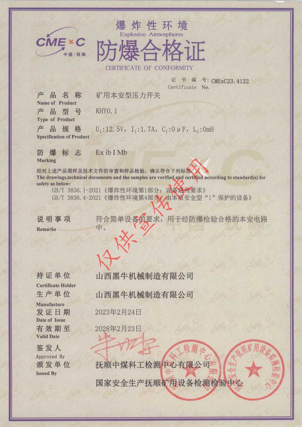 礦用本安型壓力開關(guān)合格證
